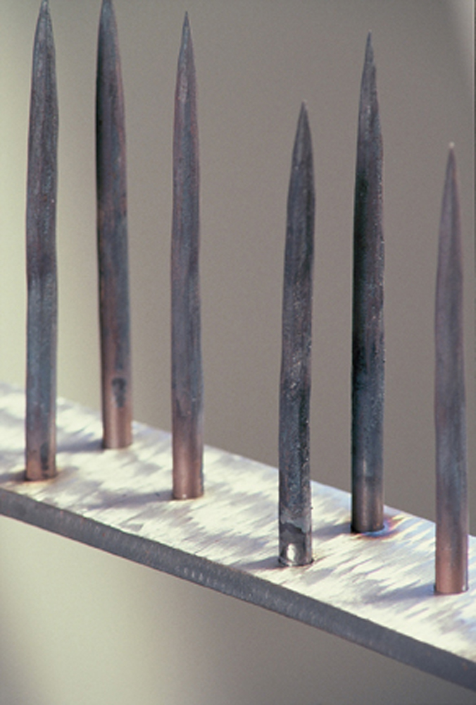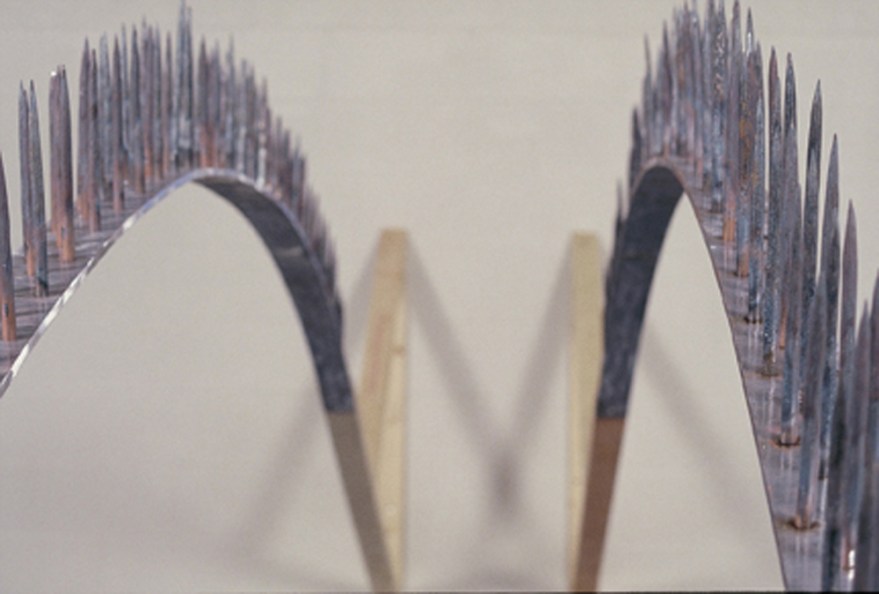 Part of an exhibit at the Minneapolis College of Art and Design. Materials: Hand forged and bent steel, wood. Dimensions 22′ x 2′ x 7′